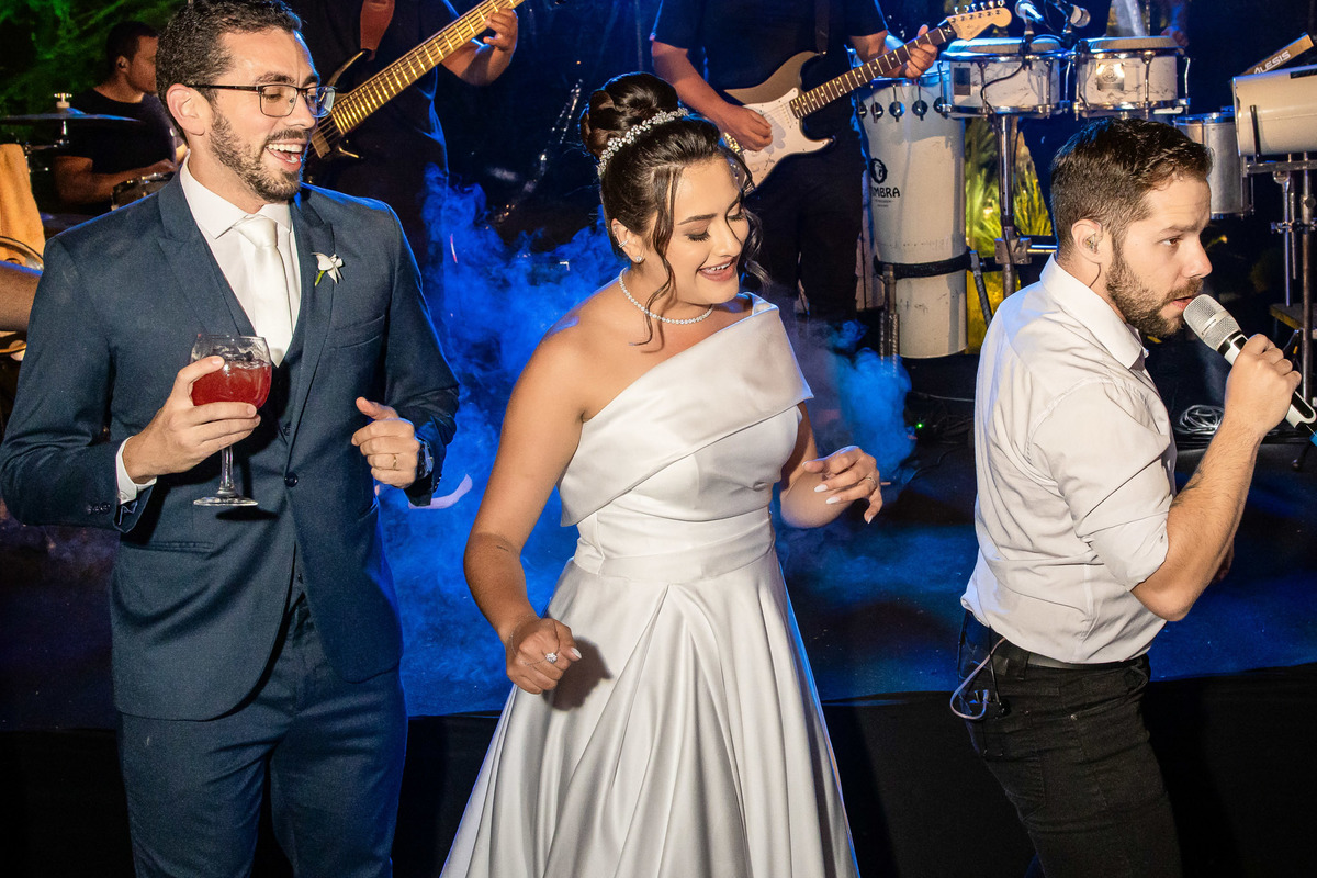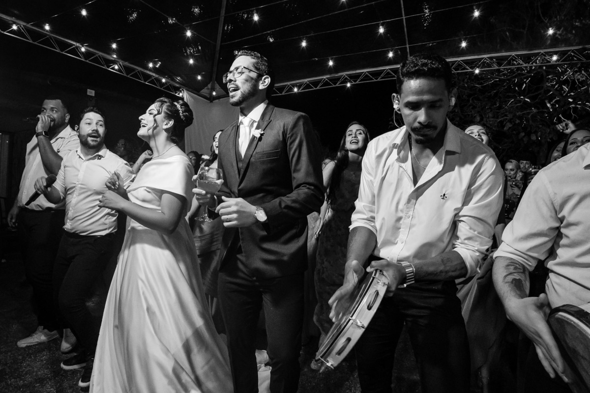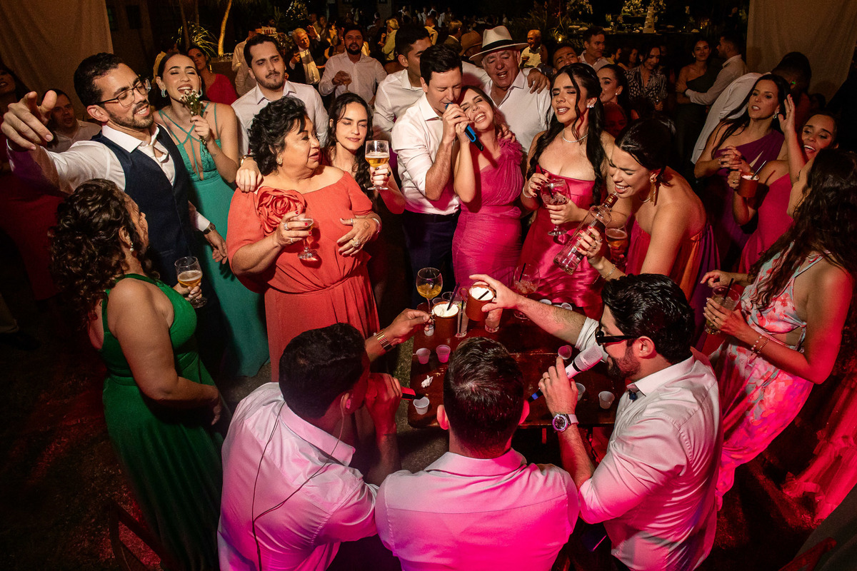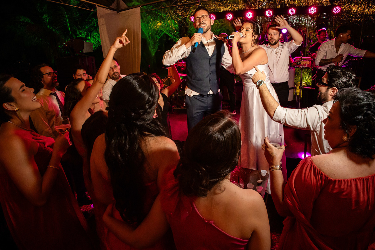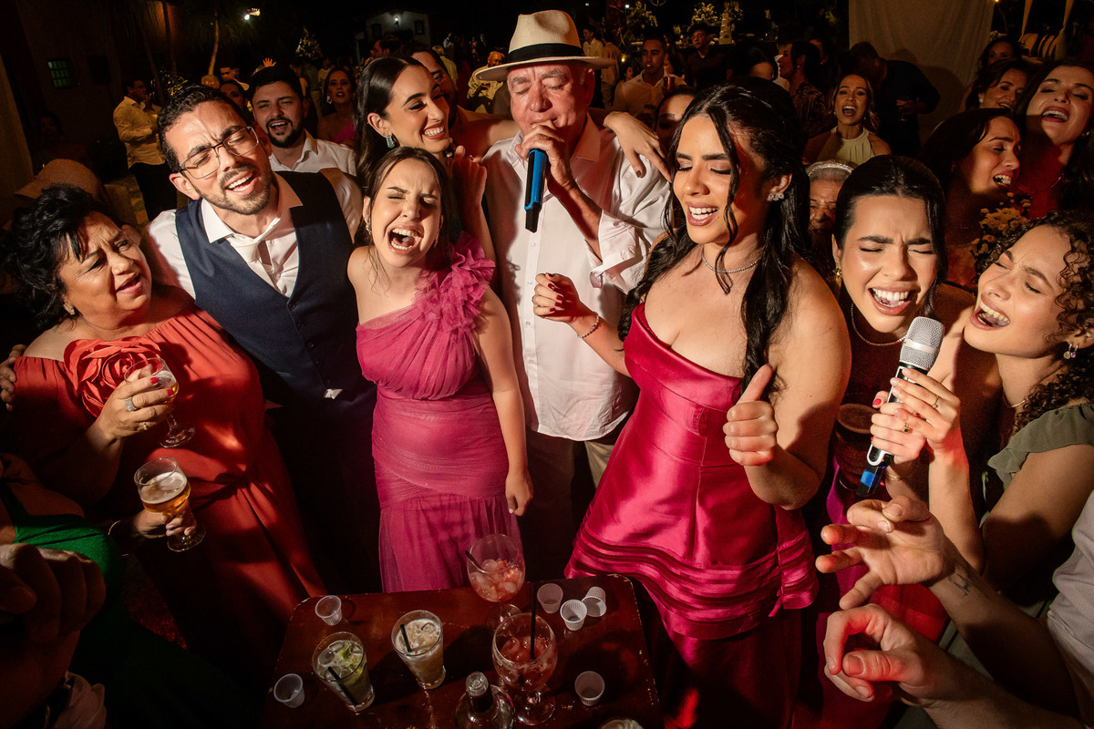 nos abraços apertados, nas risadas altas e até na música que todo mundo cantou junto com o casal.