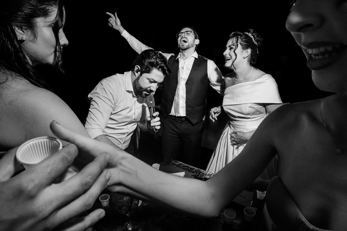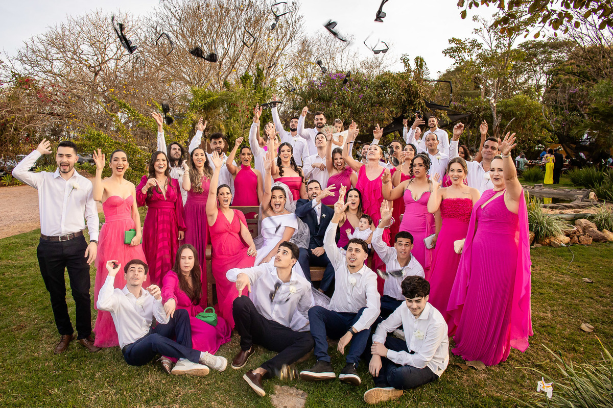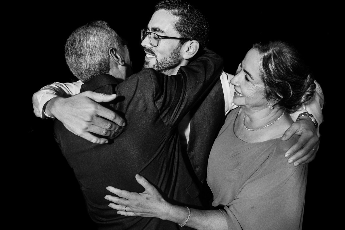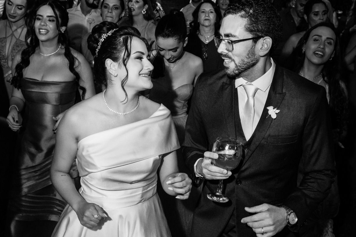 nos abraços apertados, nas risadas altas e até na música que todo mundo cantou junto com o casal.
